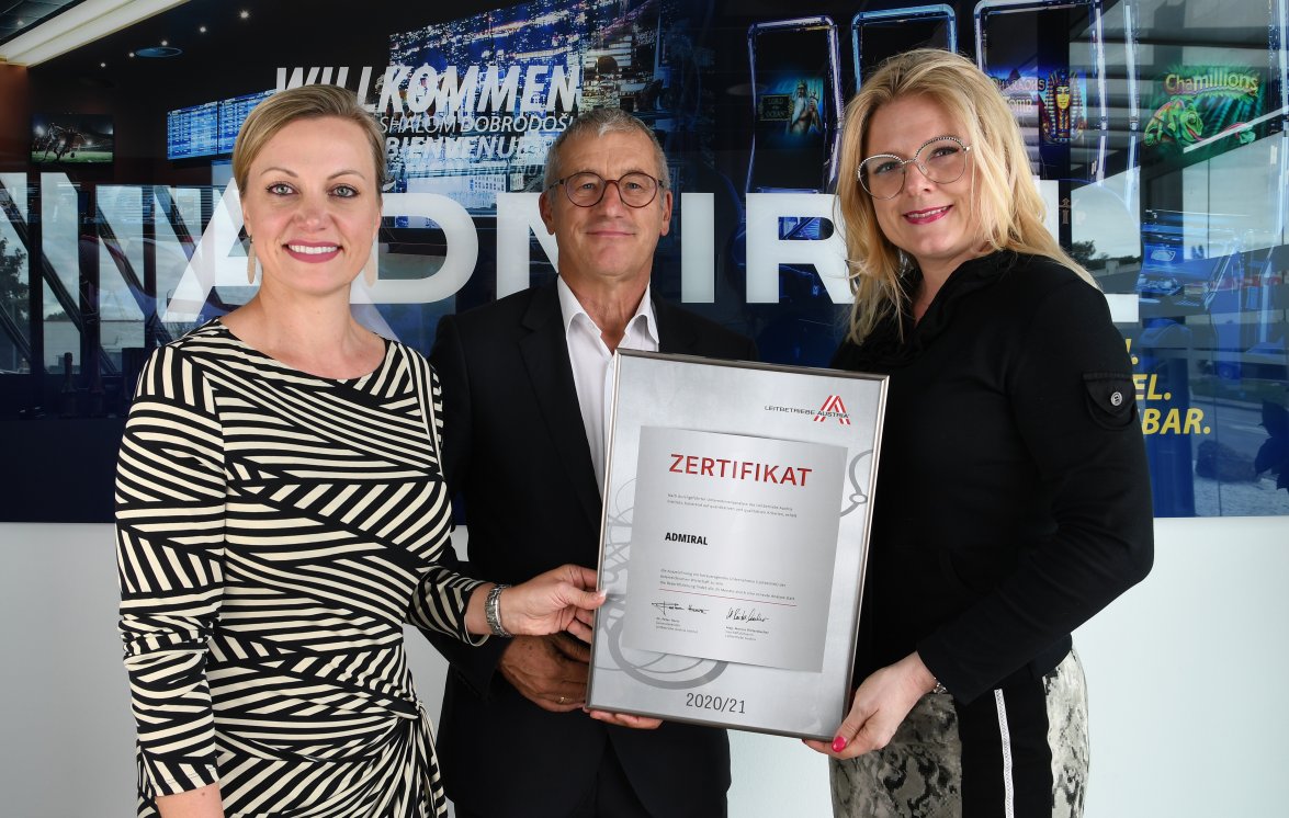 Bildtext: Dr. Monika Racek (Vorstandsvorsitzende ADMIRAL Casinos & Entertainment AG), Paul Kozelsky (Geschäftsführer ADMIRAL Sportwetten GmbH) und Mag. Monica Rintersbacher (Leitbetriebe Austria-Geschäftsführerin) bei der Zertifikatsverleihung in der ADMIRAL-Zentrale in Wiener Neudorf.