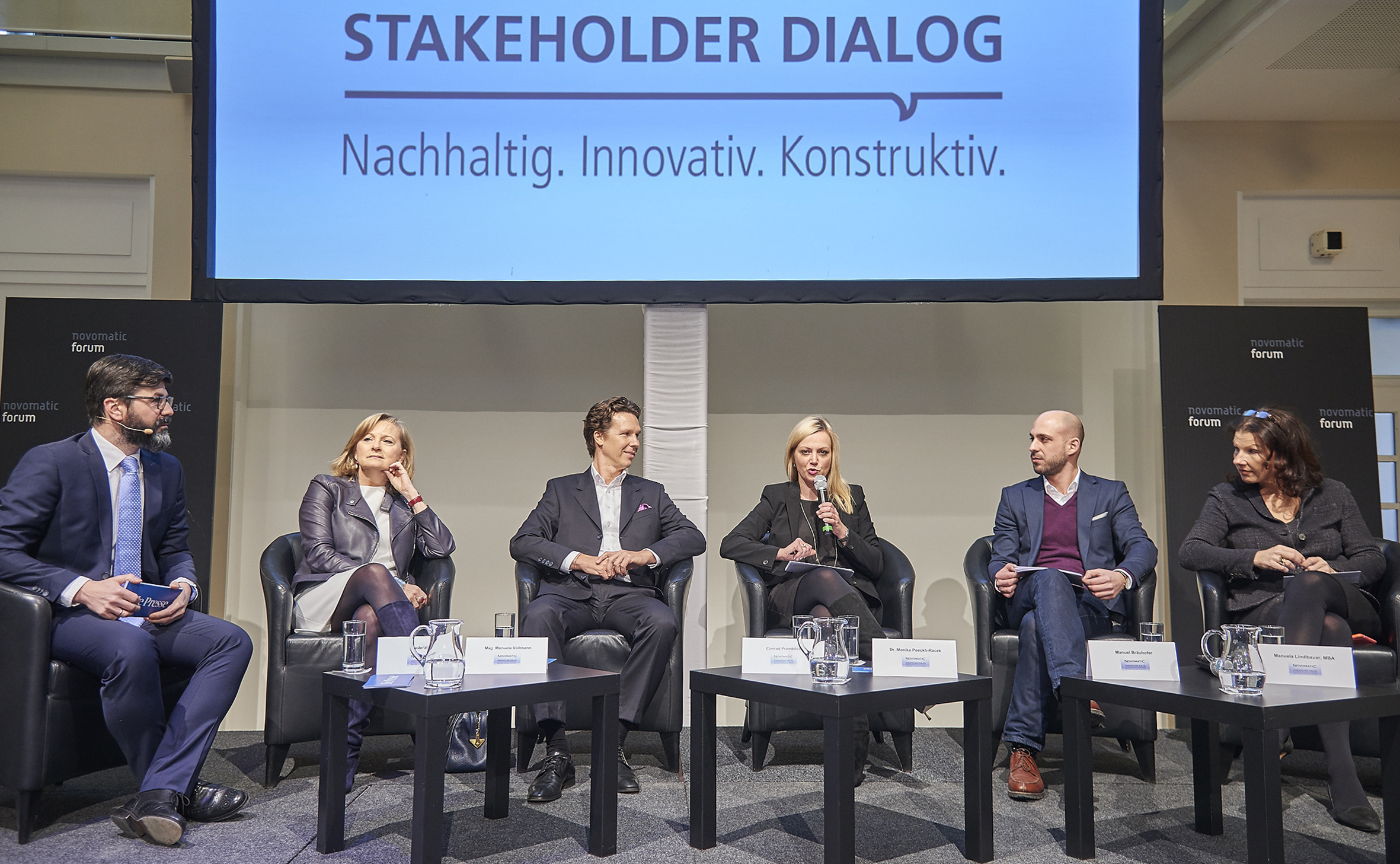 Stakeholder Dialog 2017: Vlnr: Mag. Michael Köttritsch (Moderator, DiePresse), Mag. Manuela Vollmann (Gründerin und Geschäftsführerin abz*austria), Dr. Conrad Pramböck (Pedersen & Partner), Dr. Monika Poeckh-Racek (Vorstandsvorsitzende ADMIRAL Casinos & Entertainment AG), Manuel Bräuhofer (Geschäftsführer brainworker), Manuela Lindlbauer, MBA (Gründerin und Geschäftsführerin Lindlpower Personalmanagement GmbH)